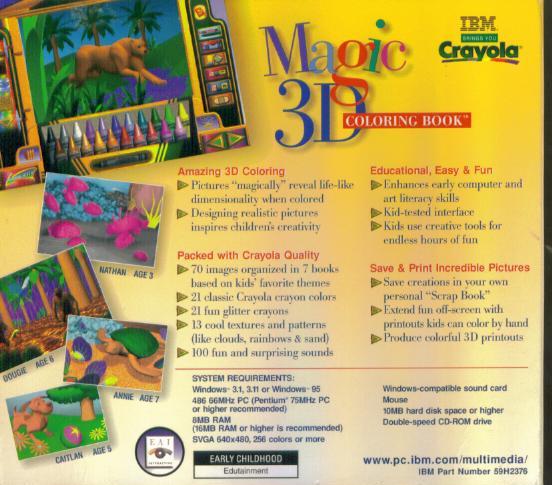 A perfect first step into creativity and computers, this software lets you color a picture and then see it come to life. There are seventy pictures to color, plus tons of fun-filled activities. It's so easy, even pre-schoolers can create dazzling 3D pictures.