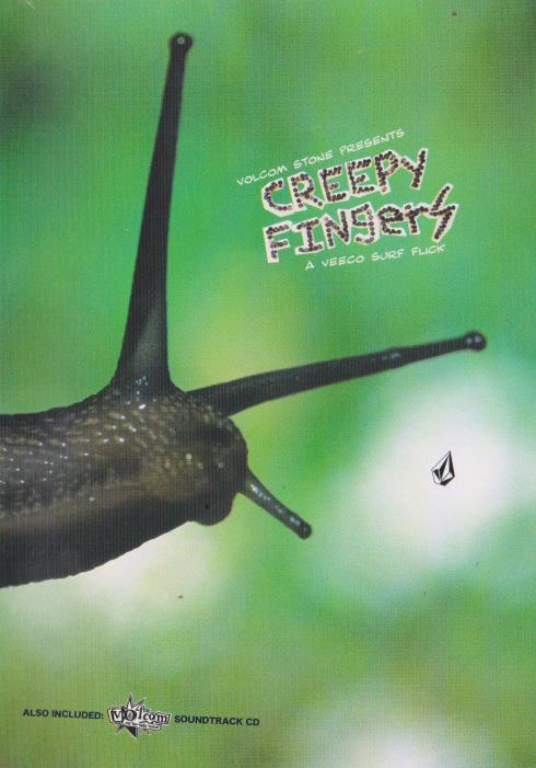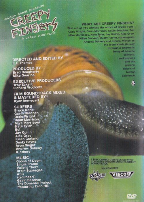 WHAT ARE CREEPY FINGERS? Find out as you witness the antics of Bruce Irons, Ozzie Wright, Dean Morrison, Gavin Beschen. Bol, Mike Morrissey, Nate Tyler, Jay Quinn, Alex Gray, Kilian Garland, Dusty Payne, super-grom Andrew Doheny and others. Watch as the team winds its way through a cinematic foray of beauty, silliness. seriousness and the general debris of hum exist