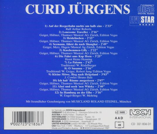 Curd Jurgens Auf Der Reeperbahn Nachts Um Halb Eins MUSIC AUDIO CD 1987 schlager
