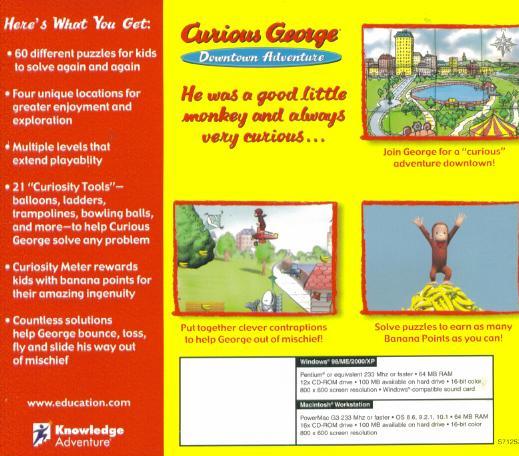 In Curious George: Downtown Adventure, Margret and H.A. Rey's lovable monkey Curious George, comes to life in a puzzle-solving adventure for PC. Designed for young children, the game features George and The Man with the Yellow Hat spending a day in the city, where George's curiosity causes an array of accidental events. By solving puzzles in four different areas of the city, children help George fix all the problems he didn't mean to cause.