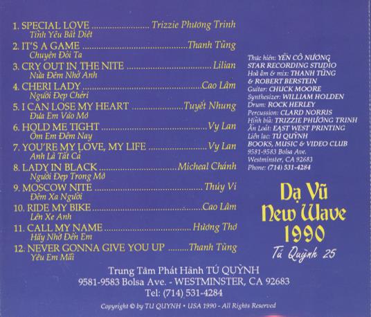 Credits: Produced by Yen Co Nuong. Star Recording Studio. Hoi am & mix: Thanh Tung & Robert Berstein. Guitar: Chuck Moore. Synthesizer: William Holden. Percussion: Clard Norris. Cover photo: Trizzie Phuong Trinh. Printed by East West Printing. Released by TU QUYNH.