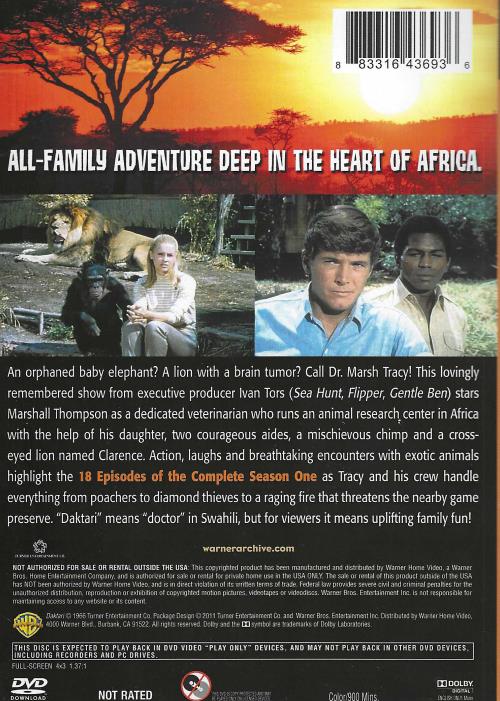 An orphaned baby elephant? A lion with a brain tumor? Call Dr. Marsh Tracy! This lovingly remembered show from executive producer Ivan Tors (Sea Hunt, Flipper, Gentle Ben) stars Marshall Thompson as a dedicated veterinarian who runs an animal research center in Africa with the help of his daughter, two courageous aides, a mischievous chimp and a cross-eyed lion named Clarence. Action, laughs and breathtaking encounters with exotic animals highlight the 18 Episodes of the Complete Season One as Tracy and his crew handle everything from poachers to diamond thieves to a raging fire that threatens the nearby game preserve. "Daktari" means "doctor" in Swahili, but for viewers it means uplifting family fun!