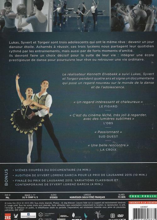DVD ZONE 2 NEUF Langues : Norvégien Sous titres : Français Inséparables et complices depuis l'enfance, Lukas, Syvert et Torgeir sont trois jeunes danseurs qui partagent le même rêve : intégrer l'Académie de ballet d'Oslo. Mais les places sont chères et les opportunités rares. Acharnés à réussir, à se perfectionner et à faire de leur corps l'instrument parfait, ils nous emmènent dans leur quotidien rythmé par la dureté des entraînements et le stress des auditions. Autant d'épreuves qu'ils sont prêts à surmonter pour, un jour, devenir danseur étoile.
