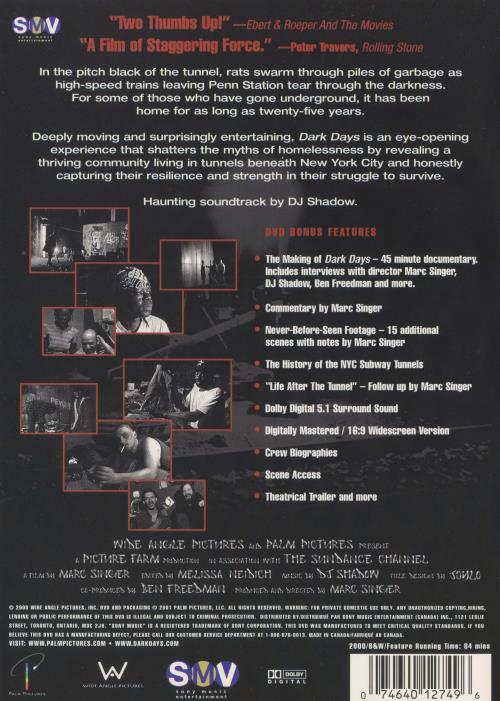In the pitch black of the tunnel, rats swarm through piles of garbage as high-speed trains leaving Penn Station tear through the darkness. For some of those who have gone underground, it has been home for as long as twenty-five years. Deeply moving and surprisingly entertaining, Dark Days is an eye-opening experience that shatters the myths of homelessness by revealing a thriving community living in tunnels beneath New York City and honestly capturing their resilience and strength in their struggle to survive. Haunting soundtrack by DJ Shadow. 140 The Making of Dark Days - 45 minute documentary. Includes interviews with director Marc Singer, DJ Shadow, Ben Freedman and more.