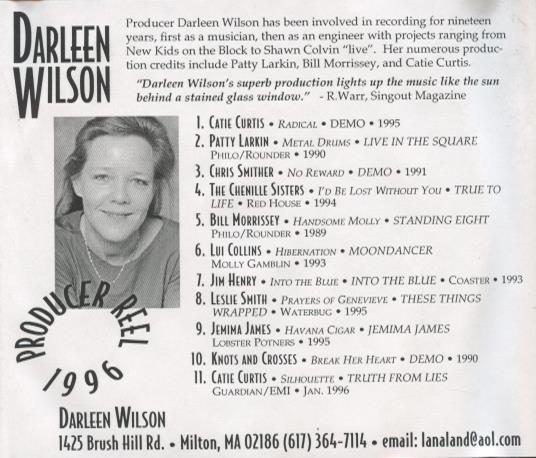 Darleen Wilson: Producer Reel PROMO MUSIC AUDIO CD Catie Curtis Demo folk 1996