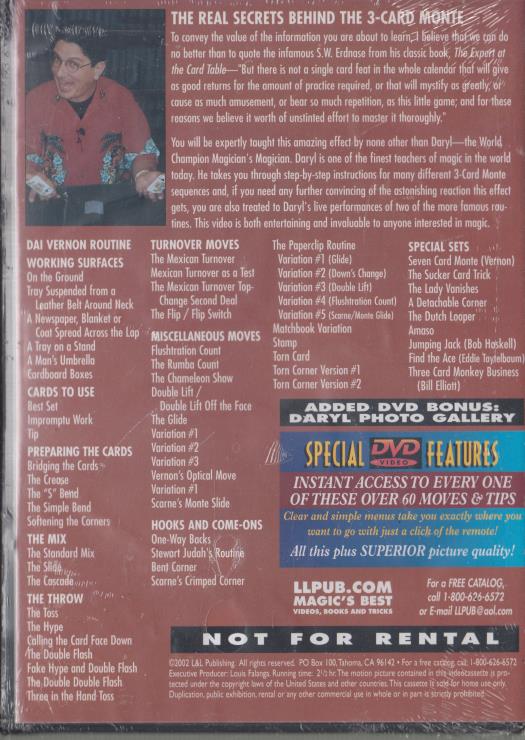 This instructional video features Daryl, the magician's magician, revealing the real secrets behind the classic 3-card monte. Clear, step-by-step demonstration and performance footage teach you how to perform convincing street-style monte routines and sleight-of-hand moves for entertainment.
