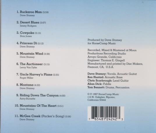 Recorded, Mixed & Mastered at Moon Productions Recording Studio. Engineer: Thomas E. Gingell. Manufactured and printed by Disc Makers. Personnel: Dave Stamey: Vocals, Acoustic Guitar; Ken Hustad: Acoustic Bass; Chris Scarbrough: Lead Guitar; Allan Dick: Fiddle; Tom Bennett: Drums, Percussion. © 1997 HorseCamp Music.
