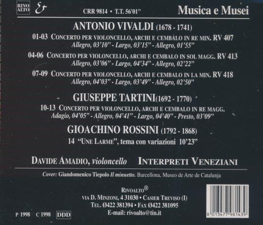 Davide Amadio is an Italian cellist who performs a program of Baroque cello concertos accompanied by the chamber ensemble Interpreti Veneziani. The album collects works by Vivaldi, Tartini and a theme with variations by Rossini, presented in historically informed style with harpsichord and string ensemble. The performances emphasize clarity of line, stylistic articulation and expressive phrasing suited to early-18th-century repertoire. Interpreti Veneziani are noted for their refined ensemble playing and their focus on Venetian baroque repertoire.