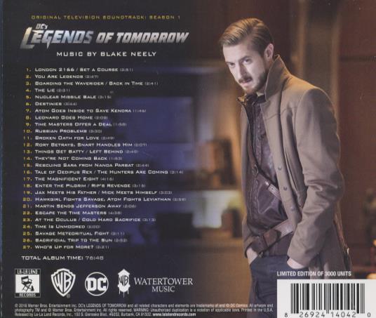 La-La Land Records, DC, Warner Bros., and WaterTower Music proudly present the original soundtrack by acclaimed composer Blake Neely (known for The Flash, Supergirl, and Blindspot) for the debut season of the popular television show DC's Legends Of Tomorrow, featuring stars Greg Berlanti, Franz Drameh, and Victor Garber.