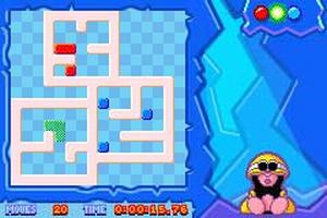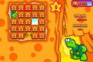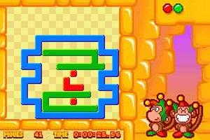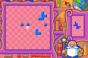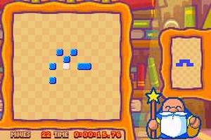 In addition to the square border around each level, many puzzles contain other static elements, which appear in white. These can be a boon or a hindrance, depending on the layout of the puzzle pieces. Most puzzles can be solved in more than one way and bonuses are awarded in some levels for bringing all the puzzle pieces together to form a certain shape. The game also tracks the time and the number of moves used to solve each puzzle, allowing players to return to levels and try to better their own scores. Denki Blocks features battery-save slots for three different players.
