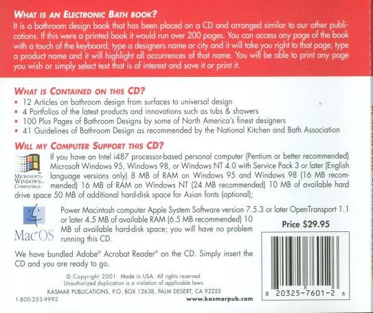 WHAT IS AN ELECTRONIC BATH BOOK? It is a bathroom design book that has been placed on a CD and arranged similar to our other publications. If this were a printed book it would run over 200 pages. You can access any page of the book with a touch of the keyboard, type a designers name or city and it will take you right to that page, type a product name and it will highlight all occurrences of that name. You will be able to print any page you wish or simply select text that is of interest and save it or print it.