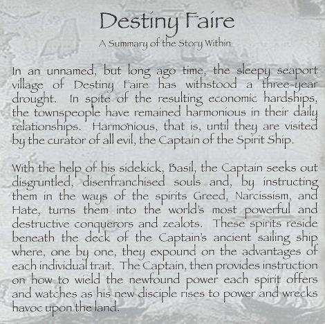 A Summary of the Story Within In an unnamed, but long ago time, the sleepy seaport village of Destiny raire has withstood a three-,year drought. Ins pite of the resulting economic hardships, the townspeople have remained harmonious in their dailsy relationships. Harmonious, that is, until they are visited 1py the curator of all evil, the Captain of the Spirit ship. with the help of his sidekick, basil, the Captain seeks out disgruntled, disenfranchised souls and, by instructing them in the ways of the spirits Greed, Narcissism, and Hate, turns them into the world's most powerful and destructive conquerors and zealots. These spirits reside beneath the deck of the Captain's ancient sailing ship where, one 6,9 one, they expound on the advantages of each individual trait. The Captain, then provides instruction on how to wield the newfound power each spirit offers and watches as his new disciple rises to power and wrecks havoc upon the land.