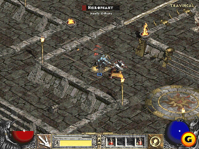 Although it was hugely successful both commercially and critically, the original Diablo was criticized for its relatively short single-player game and solitary dungeon setting. Diablo II is set in a much larger gaming world, and its action isn't isolated to a single locale. Divided into four distinct acts, each with its own setting, Diablo II now permits outdoor exploration in addition to a predictable series of dungeon crawls, although the outdoor areas aren't terribly interesting in and of themselves. The overall goal of Diablo II is exactly the same as it was in the first game, namely to hack through hordes of monsters to gain items and enhance your abilities so you can confront and speedily dispatch the resident Lord of Terror, Diablo. This time around there's a better story to serve as the framework for the slaughter, as each of the game's acts is linked together with impressively produced and lengthy cinematic cutscenes. The quests you receive are no longer random, as they were in the single-player version of the original game, and collectively the tasks in each act are loosely linked together to make the overall story more cohesive. Diablo II's primary focus is still on action-oriented gameplay, but the more sophisticated presentation of the cutscenes and the additional plot depth give the action context and more relevance than in the original game.