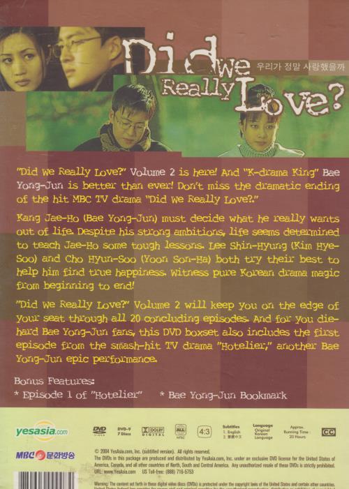 Did We Really Love Volume 2 will keep you on the edge of your seat through all 20 concluding episodes. And for you die-hard Bae Yong-Joon fans, this DVD boxset also includes the first episode from the smash-hit TV drama Hotelier, another Bae Yong-Joon epic performance.
