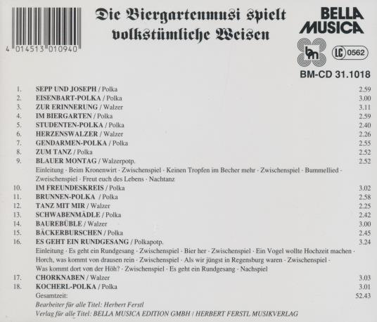 Label: Bella Musica Edition GmbH. LC 0562. Cat No: BM-CD 31.1018. Bearbeiter für alle Titel: Herbert Ferstl. Gesamtzeit: 52:43.