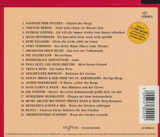 Die Hits des Jahres 1994 vorgestellt von Carolin Reiber. CD zur gleichnamigen ZDF-Sendung. Compilation credits: Herzklang / Sony Music Entertainment (Germany) GmbH. Catalog number: HER 478249 2.
