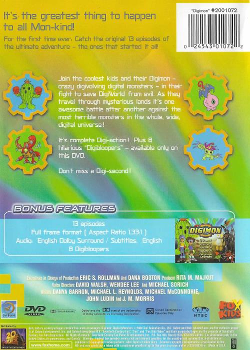Its the greatest thing to happen to all Mon-kind! For the first time ever: Catch the original 13 episodes of the ultimate adventure - the ones that started it all! Join the coolest kids and their Digimon - roN crazy digivolving digital monsters - in their fight to save DigiWorld from evil. As they travel through mysterious lands it's one awesome battle after another against most terrible monsters in the whole, wid• digital universe ! It's complete Digi-action ! Plus 8 hilarious Digibloopers" - available only on this DVO. Don't miss a Digi-second! TM BONUS 13 episodes