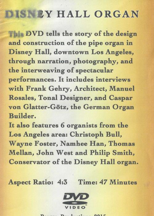 Disney Hall Organ DVD tells the story of the design and construction of the pipe organ in Disney Hall, downtown Los Angeles, through narration, photography, and the interweaving of spectacular performances. It includes interviews with Frank Gehry, Architect, Manuel Rosales, Tonal Designer, and Caspar von Glatter-Gotz, the German Organ Builder. It also features 6 organists from the Los Angeles area: Christoph Bull, Wayne Foster, Namhee Han, Thomas Mellan, John West and Philip Smith, Conservator of the Disney Hall organ. Aspect Ratio: 4:3 Time: 47 Minutes