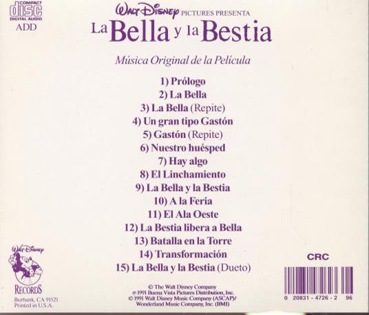 Disney's La Bella Y La Bestia: Musica Original De La Pelicula MUSIC AUDIO CD '91