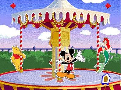 Once you launch Disney's Print Studio Deluxe you will arrive at the character carousel. Click on a character in the carousel to choose a particular character set and begin working on a project. Click on the arrows at the top of the screen to rotate the carousel to the left or right one partial turn. Click on the house icon in the lower right corner to exit Disney's Print Studio Deluxe. Once you enter the project screen you will be prompted to choose a project. Simply click on the project to select it. You may be asked to choose the type of paper or stock you will be using when printing your project.