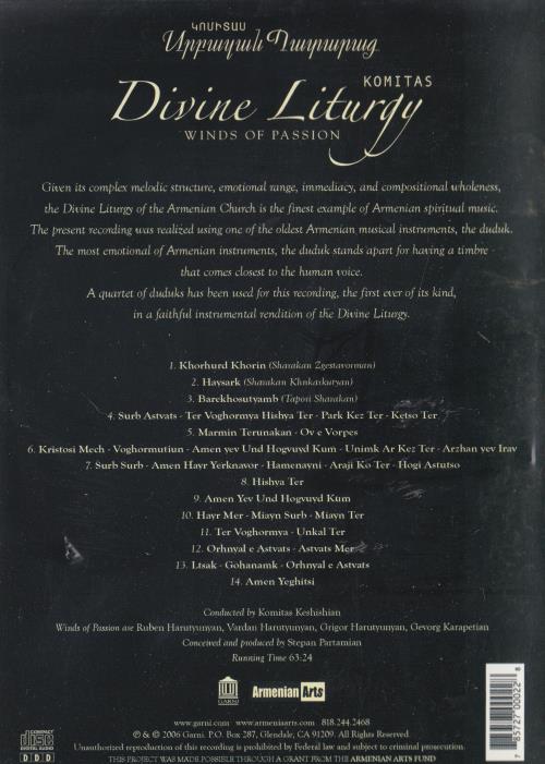 Given its complex melodic structure, emotional range, immediacy, and compositional wholeness, the Divine Liturgy of the Armenian Church is the finest example of Armenian spiritual music. This recording was realized using one of the oldest Armenian musical instruments, the duduk. The duduk, the most emotional of Armenian instruments, stands apart for having a timbre that comes closest to the human voice.