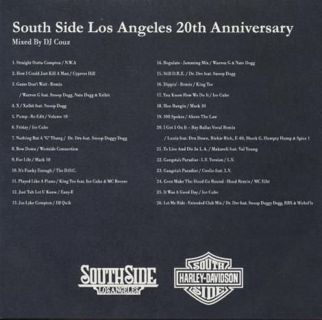 South Side Los Angeles 20th Anniversary Mixed By DJ Couz 1. Straight Outta Compton / N.W.A 2. How I Could Just Kill A Man / Cypress Hill 3. Game Don't Wait- Remix / Warren G feat Snoop Dogg, Nate Dogg & Xvi bit 4. X/ /leant feat. Snoop Dogg 5. Pump -Re-Edit/ Volume 10 6. Friday/ Ice Cube 7. Nothing But A 'V Thong/ Dr. Dre feat. Snoop Doggy Dogg 8. Bow Down / Westeide Connection 9. Foe Life / Mack 10 10. It's Funky Enough / The D.O.C. II. Played Like A Piano / King Tee feat. Ice Cube & MC Breese 12. Just Tah Let U Know / Easy.E 13. Joe Lyke Compton / DJ Quik gOUTEISIDE 14. Regulate -Jamming Mix/ Warren G & Nate Dogg 15. Still D.R.E. / Dr. Dre feat. Snoop Dogg 16. Dippin'.Remix / King Tee 17. You Know How We Do It/ Ice Cube 18. Hoe Bangin/ Mack 10 19. 100 Spokes/ Above The Law 20. I Got 5 On It— Bay Ballas Vocal Remix / Lu nix feat. Dry Down, Richie Rich, E-40, Shock G, Humpty Hump & Spice I 21. To Live And Die In L.A. / Makaveli feat. Vol Young 22. Gangstak Paradise -L.V. Version / L.V. 23. Couple's Paradise / Coolie feat. L.V. 24. Gees Make The Hood Go Round - Hood Remix / MC Fiht 25. It Was A Good Day/ Ice Cube 26. Let Me Ride - Extended Club Mix / Dr. Dre feat. Snoop Doggy Dogg, RBX & Michelle