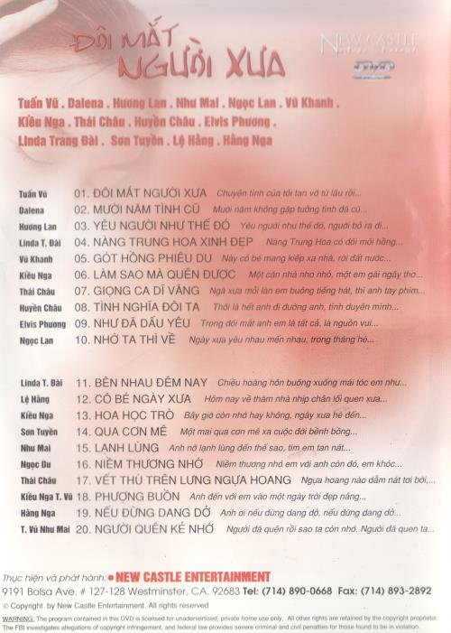 This compilation is a Vietnamese karaoke collection of classic songs performed by well-known Vietnamese artists. The DVD features 20 tracks with on-screen lyrics for singing along.