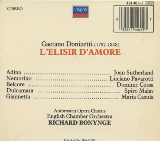 The Gaetano Donizetti / Joan Sutherland, Luciano Pavarotti, Dominic Cossa, Spiro Malas, Maria Casula, English Chamber Orchestra, Ambrosian Opera Chorus, Richard Bonynge: L'Elisir D'Amore