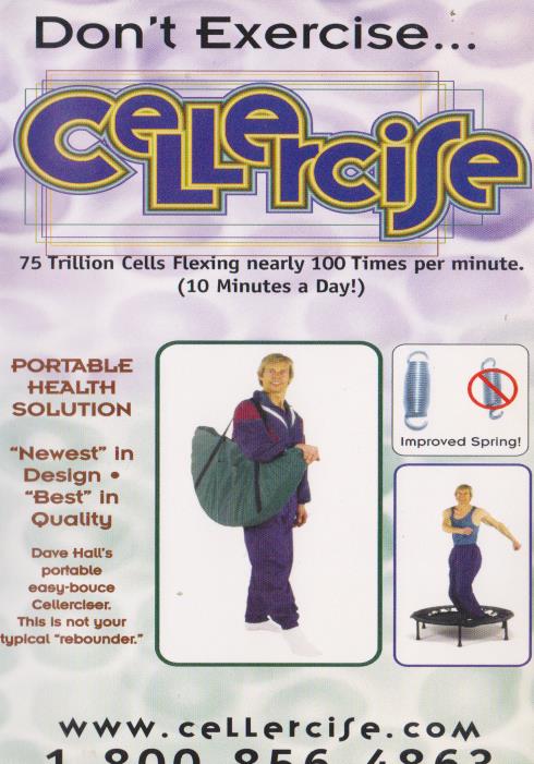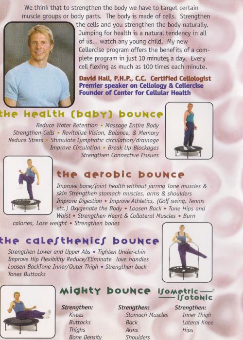 We think that to trengthen the body we have to target certain muscle groups or body parts. The body is made of cells. Strengthen the cells and you strengthen the body naturally. Jumping for health is a natural tendency in all of us...watch any young child. My new Cellercise program offers the benefits of a complete program in just 10 minutes a day. Every cell flexing as much as 100 times each minute.