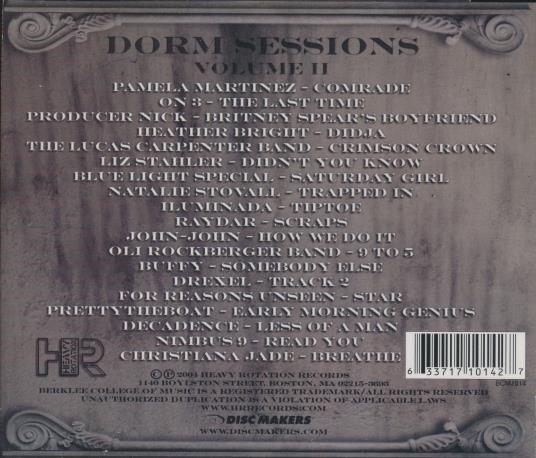 Dorm Sessions Volume II is a compilation of emerging artists and bands recorded for the Dorm Sessions series. The release features a broad mix of indie pop, acoustic singer-songwriter material and alternative rock tracks. Many contributors are up-and-coming performers showcasing polished songwriting and intimate production. The compilation captures a college-town, Berklee-influenced indie spirit with accessible melodies and DIY energy.