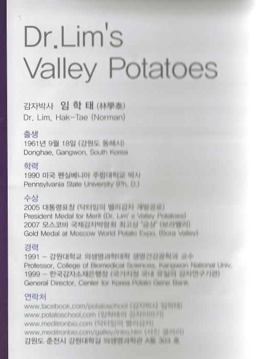 Over a span of 32 years, Professor Im has developed more than 20 potato varieties, including functional colored potatoes, Gogu Valley (Sweet potato and potato), Golden King (Geumwang potato), and Tongil (Chuwang potato).