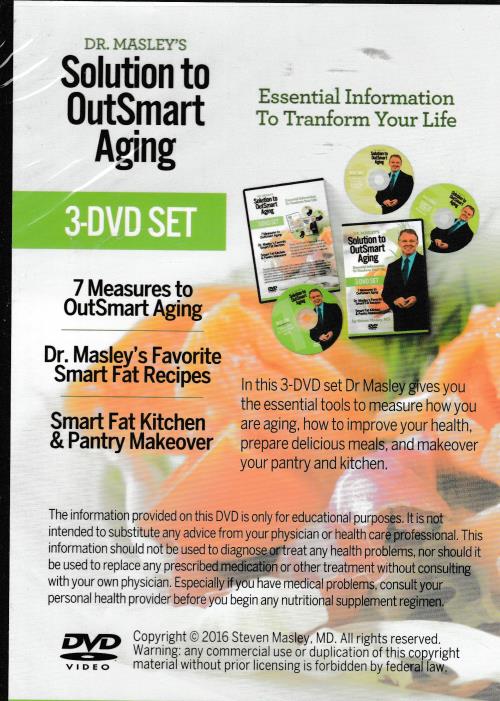 Solution to OutSmart Aging Essential Information To Tranform Your Life ASO 7 Measures to OutSmart Aging Dr. Masley's Favorite Smart Fat Recipes Smart Fat Kitchen & Pantry Makeover In this 3-DVD set Dr Masley fives you the essential tools to measure how you are aging, how to improve your health, prepare delicious meals, and makeover your pantry and kitchen.