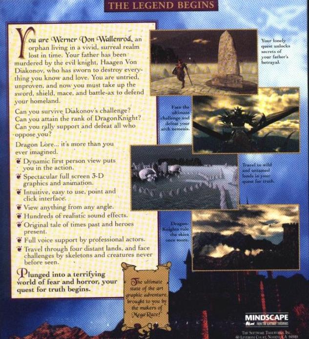 Dragon Lore is a graphic adventure where you guide the actions of Werner Von Wallenrod, a young man whose father, Axel, has been murdered by a despicable knight named Haagen Von Diakonov. You are a novice, unprepared for the rigors of the hard life ahead. You'll have to learn skills like sword fighting, mace mashing, battle-axe bashing and defense to avenge your father and put the evil tyrant Von Diakonov out of business.