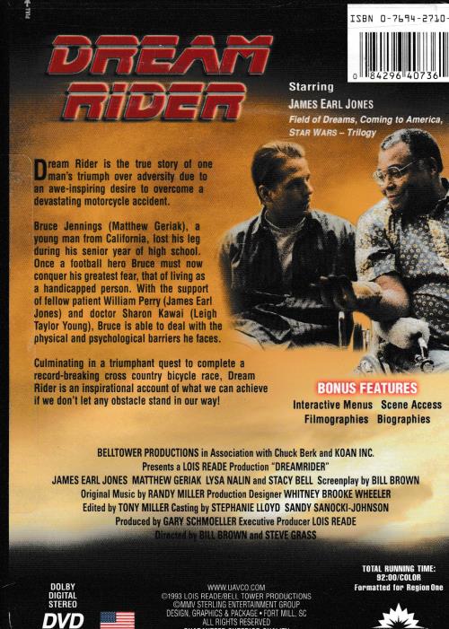 Starring JAMES EARL JONES Field of Dreams, Coming to America, STAR WARS — Trilogy Dream Rider is the true story of one man's triumph over adversity due to an awe-inspiring desire to overcome a devastating motorcycle accident. Bruce Jennings (Matthew Geriak), a young man from California, lost his leg during his senior year of high school. Once a football hero Bruce must now conquer his greatest fear, that of living as a handicapped person. With the support of fellow patient William Perry (James Earl Jones) and doctor Sharon Kawai (Leigh Taylor Young), Bruce is able to deal with the physical and psychological barriers he faces. Culminating in a triumphant quest to complete a record-breaking cross country bicycle race, Dream Rider is an inspirational account of what we can achieve if we don't let any obstacle stand in our way!