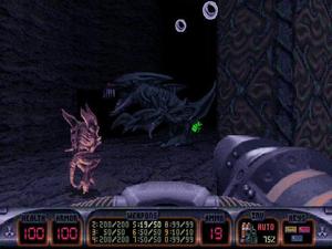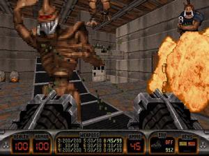 Duke Nukem can attack enemies with one of ten weapons, or if he runs out of ammo, perform a swift kick with his mighty foot. Among the more noteworthy armaments are pipe bombs, laser-activated trip bombs, plasma cannons, shrinkers, and expanders. Shrinkers reduce enemies to a fraction of their size, while expanders inflate enemies until they explode. In addition to the single-player campaign, Duke Nukem 3D offers cooperative as well as competitive action for up to eight players. Also included with the game is a built-in editor for designing custom levels.