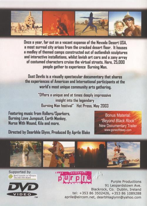Once a year, far out an a vacant expanse of the Nevada Desert USA, a most surreal city arises from the cracked desert floor. It houses a medley of themed camps constructed out of outlandish sculptures and interactive installations, whilst lavish art cars and a zany array of costumed characters cruise the virtual streets. Here, 25,000 people gather to experience Burning Man. Dust Devils is a visually spectacular documentary that shares the experiences of American and International participants at the world's most unique community arts gathering. "Offers a unique and at times deeply impressive insight into the legendary Burning Man festival" Hot Press, May 2003 Featuring music from Rollers/Sparkers, Burning Lave Jumpsuit, Earth Monkey, Nurse With Wound, Kila and more. Directed by Dearbhla Glynn, Produced By Aprile Blake Bonus Material: "Beyond Black Rock" New Documentary Trailer