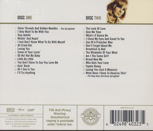 Dusty Springfield is a celebrated British pop and soul singer whose career began in the 1960s. She is best known for her smoky, emotional vocal delivery and for bringing soul music to a mainstream audience. This compilation collects many of her best-loved recordings, highlighting both her uptempo pop hits and slower, soulful ballads. Her repertoire spans classic pop, blue-eyed soul and sophisticated adult contemporary arrangements.
