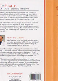 This scientifically proven system will enable you to lose your cravings and food addictions, while guiding your taste buds to , prefer healthful foods over low-nutrient ones. Medical research proves this is the most effective weight loss method ever studied. Participants lost an average of 53 pounds—and kept it off! Use high-nutrient foods to lose weight and keep it off, overcome disease, reverse diabetes, lower your blood pressure and cholesterol without medications, protect yourself against cancer and get more pleasure out of eating. Eat For Health will transform your thinking and empower you to improve your health. It can save your life. ABOUT THE AUTHOR Joel Fuhrman, M.D., is a board-certified family physician specializing in lifestyle and nutritional medicine and a graduate of the University of Pennsylvania School of Medicine. As one of the country's leading experts on nutrition and natural healing, Dr. Fuhrman has been featured in hundreds of magazines and on major radio and television shows, including: "Good Morning America," CNN, "Good Day NY," TV Food Network, and the Discovery Channel's "Second Opinion with Dr. Oz."