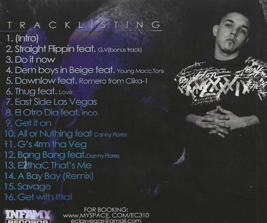 T R A C K L I N G 1. (Intro) 2. Straight Flippin feat. G.V (Lanus track) 3. Do it now 4. Dem boys in Beige feat. Young Macc,Tons 5. Downlow feat. Romero from Cliko-1 6. Thug feat. Love 7. East Side Las Vegas 8. El Otro Dia feat. into 9. Get it on 10. All or Nuthing feat Canny Acres 11. G's 4rm tha Veg 12. Bang Bang feat.Danny Flores 13. ElthaC That's Me 14. A Bay Bay (Remix) 15. Savage 16. Get with ti-.f mom