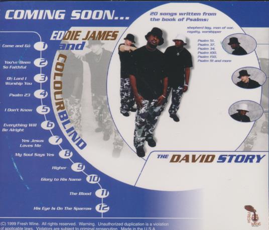 Eddie James and Colourblind are a US gospel group that blend contemporary gospel with hip-hop and R&B influences. The project draws heavily from the Book of Psalms, with songs that reinterpret and celebrate psalm texts in a modern urban gospel setting. The group presents energetic vocal arrangements alongside spoken and rhythmic elements that reflect both church and street influences. Their work aims to bridge traditional worship material with contemporary musical styles to reach diverse audiences.