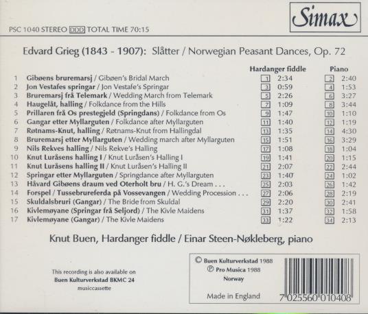 This release features Edvard Grieg's Slåtter (Norwegian Peasant Dances), Op. 72, presented with the original fiddle tunes from Telemark. The performances pair Knut Buen on the traditional Hardanger fiddle with pianist Einar Steen-Nøkleberg, blending classical piano technique with authentic Norwegian folk fiddle styles. The program highlights the rural dance forms and melodic character of Telemark and other regions, preserving the peasant-dance atmosphere in Grieg's compositions. The result is a vivid folk-classical collaboration that emphasizes both virtuosity and traditional timbre.
