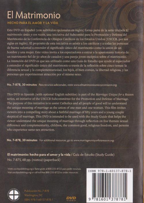 El Matrimonio: Hecho Para El Amor Y La VidaEl Matrimonio HECHO PARA EL AMOR Y LA VIDA Este DVD en Espanol (con subfitulos opcionales en ingles) forma parte de la serie titulada El matrimonio: fink° y con razor, una iniciativa del Subcomite para la Promotion y Defensa del Matrimonio de la Conferencia de Obispos Catolicos de los Estados Unidos (USCCB, por sus siglas en ingles). El proposito dc esta iniciativa es asistir a los catolicos ya todas las personas de buena voluntad a emender el significado Calico del matrimonio como la union de un hombre y una mujer. Este video Myna a los espectadores a entrar a to apasionante historia de un matrimonio fief de so alias de casados y una pareja joven esceptica sobre el matrimonio. La intention del DVD es que sea utilizado como una Guia de Estudio que ayude al espectador a entender el significado unico del matrimonio a traces de la reflexiOn sobre cinco temas: la dtferencia sexual y la complementadedad, los hijos, el Men comun, la libertad religiosa, y las personas que experimentan atraccion por el mismo sexo. No. 7-878, 30 minutes Para recursos adicionales