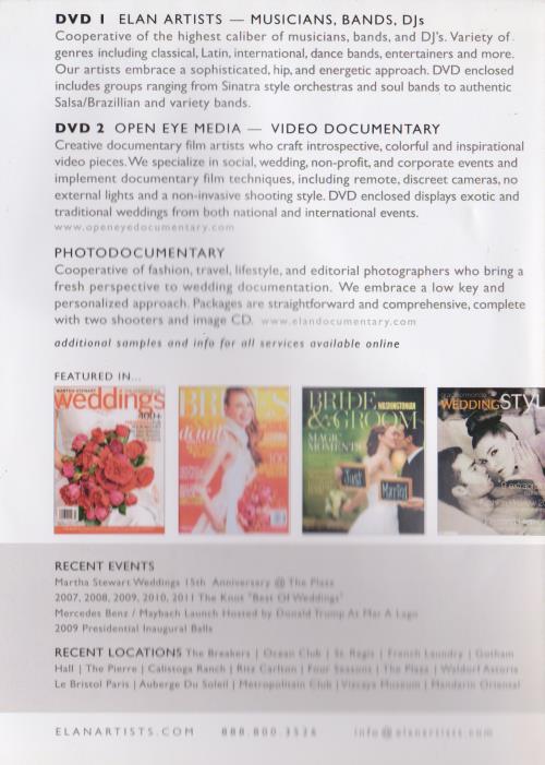 DVD I ELAN ARTISTS — MUSICIANS, BANDS, DJs Cooperative of the highest caliber of musicians, bands, and DJ's. Variety of genres including classical, Latin, international, dance bands, entertainers and more. Our artists embrace a sophisticated, hip, and energetic approach. DVD enclosed includes groups ranging from Sinatra style orchestras and soul bands to authentic Salsa/Brazillian and variety bands.