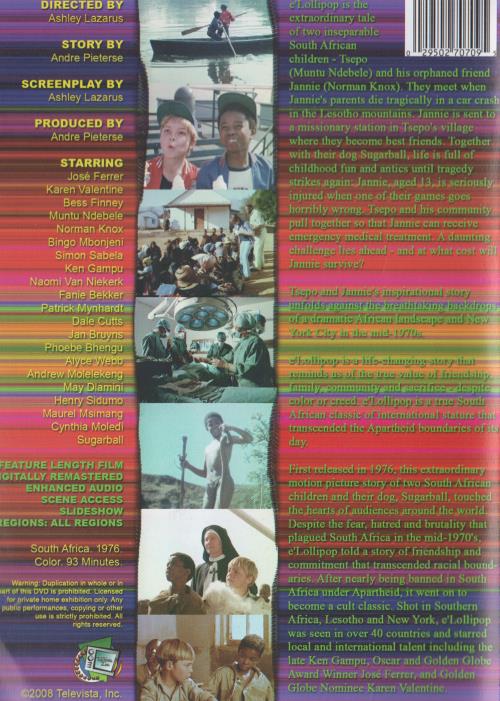 First released in 1976, this extraordinary motion picture story of two South African children and their dog, Sugarball, touched the hearts of audiences around the world. Despite the fear, hatred and brutality that plagued South Africa in the mid-1970s, e'Lollipop told a story of friendship and commitment that transcended racial boundaries. After nearly being banned in South Africa under Apartheid, it went on to become a cult classic. Shot in Southern Africa, Lesotho and New York, e'Lollipop was seen in over 40 countries and starred local and international talent including Ken Gampu, Oscar and Golden Globe Award winner Jose Ferrer, and Golden Globe nominee Karen Valentine.