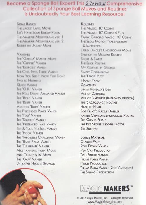 Undoubtedly the most comprehensive collection of sponge ball moves and routines! This 2 1/2 hour instructional DVD is an essential learning resource for magicians of all levels who want to master sponge ball technique and routines.