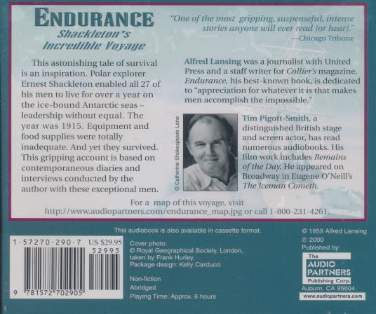 Alfred Lansing was a journalist with United Press and a staff writer for Collier's magazine. Endurance, his best-known book, is dedicated to "appreciation for whatever it is that makes men accomplish the impossible."
