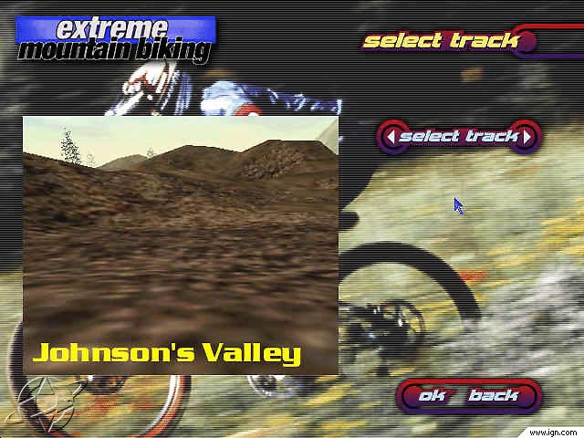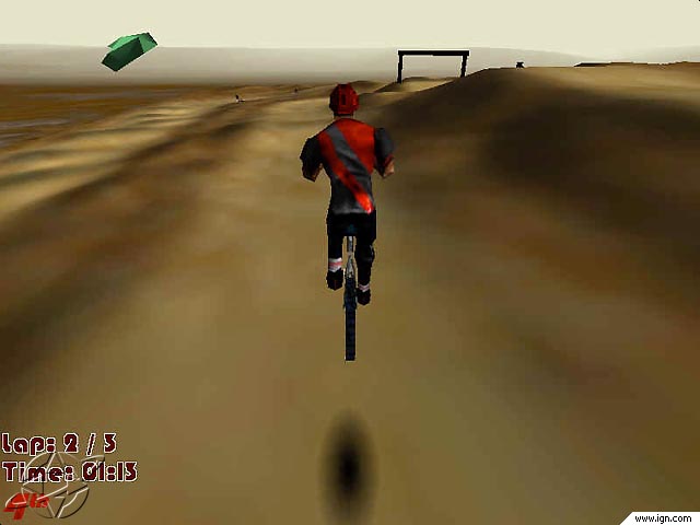 In Gate Racing, you race against another rider in a slalom style race to the bottom of the mountain. You must cross between the red and blue gates to finish the race. If you miss one, the race does not end until you go back and cross it. The best Gate Racers on the Trek Team are Ethel, Chasie and Leroy. If you complete an event faster than the five previous fastest times (or with more points in the Trials Event), you can enter and save your name in the records kept for each event. Extreme Mountain Biking is for one player only and features several camera angles from which to choose.