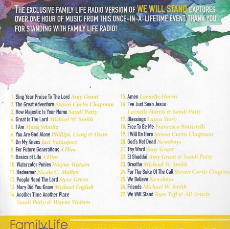 THE EXCLUSIVE FAMILY LIFE RADIO VERSION OF WE WILL J CAPTURES OVER ONE HOUR OF MUSIC FROM THIS ONCE-IN-A-LIFETIME EVENT. FOR STANDING WITH FAMILY LIFE RADIO! Sing Your Praise To The Lord The Great Adventure How Majestic Is Your Name Great Is The Lord I Am You Are God Alone On My Knees For Future Generations Basics of Life Watercolor Ponies Redeemer People Need The Lord Mary Did You Know Another Time Another Place Amen I've Just Seen Jesus Blessings Free To Be Me I Will Be Here God's Not Dead Thy Word El Shaddai Breathe For The Sake Of The Call We Believe Friends We Will Stand Fami.42 Inel!