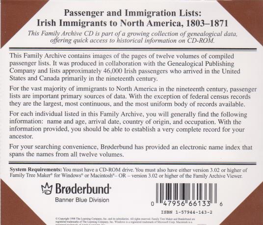 Family Tree Maker Archives Immigration Lists: Irish Immigrants 1803-1871 PC CD