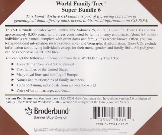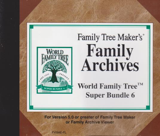With 5 CD-ROMs encompassing World Family Tree Volumes 28, 29, 30, 31, and 32, Super Bundle 6 includes details like important dates, family links, source notes, and biographical data (note: data on living individuals is limited to name, gender, and family links). With more than 6 million names on over 8,000 pedigrees contributed by family history enthusiasts, all data can be exported easily as GEDCOM files. You can get the following information from these Family Archive CDs: • Trees dating from pre-1600 to present • First families of the United States • Trees containing individuals from all over the world • Many royal lines and nobility of Europe • Trees containing first and last names • Dates of birth, marriage, and death • Relationships of family members